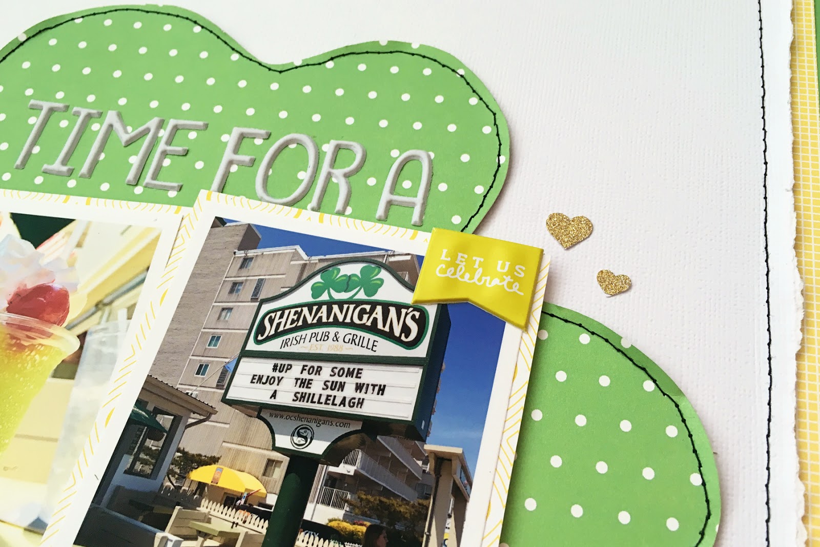 The sketch calls for a large heart on the background of the page. Never feel like you need to incorporate all of the elements on the sketch. I love hearts on my pages, and use them frequently. I decided to challenge myself though to use something different. I decided on a shamrock so that I could scrap these photos.